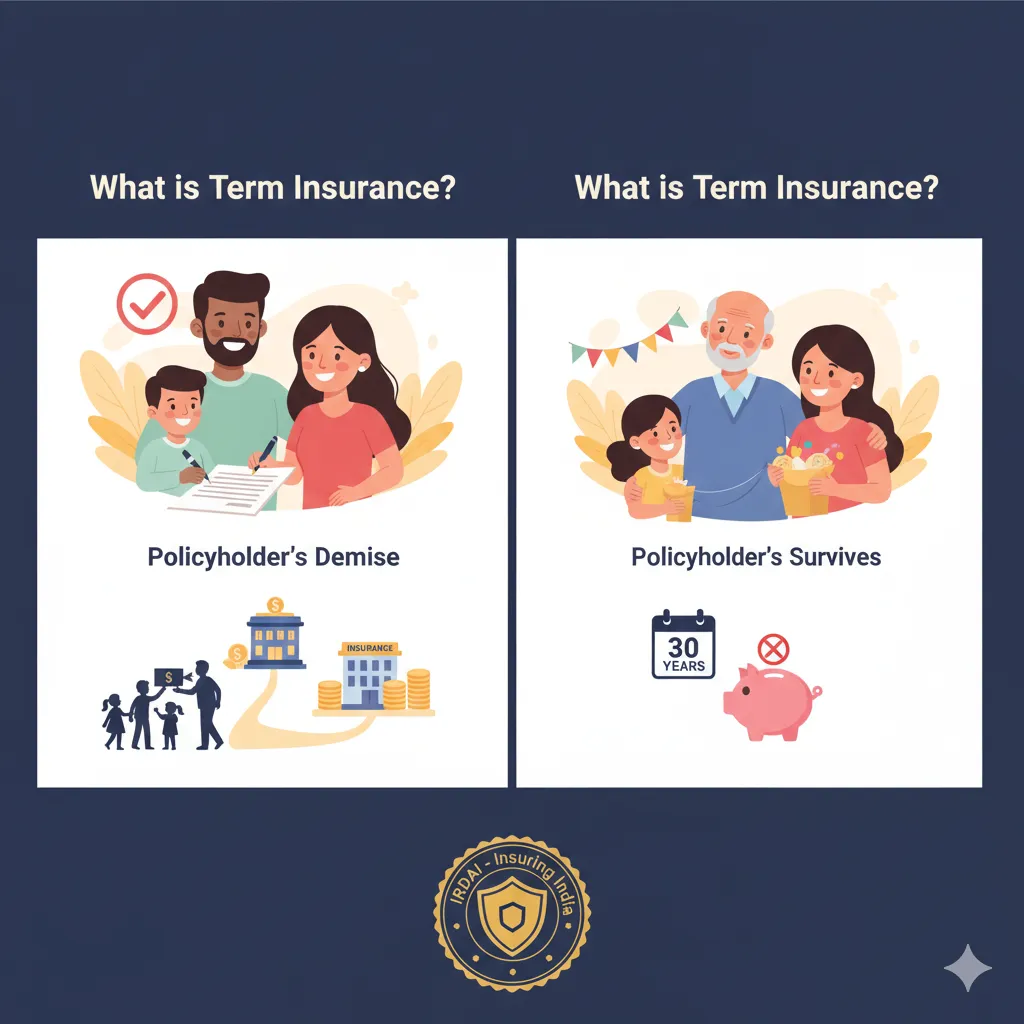 टर्म इन्शुरन्स म्हणजे काय? सोप्या शब्दांत सांगायचे तर, ठरावीक कालावधीसाठी (Term) घेतलेला जीवन विमा. या कालावधीत पॉलिसीधारकाचा मृत्यू झाल्यास विमा कंपनी कुटुंबाला ठरलेली विमा रक्कम (Sum Assured) देते. मात्र, पॉलिसीधारक जिवंत राहिला आणि कालावधी पूर्ण झाला तर साधारण टर्म प्लॅनमध्ये कोणतीही रक्कम परत मिळत नाही (रिटर्न ऑफ प्रीमियम प्रकार वगळता).